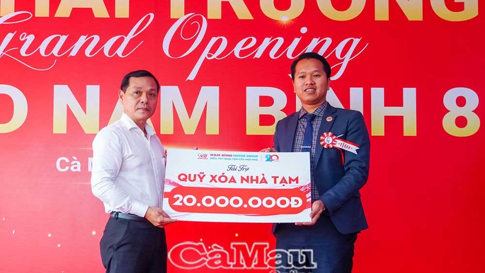 Nhân dịp khai trương, Nam Bình Motor Group hỗ trợ 20 triệu đồng ủng hộ chương trình xoá nhà tạm, nhà dột nát trên địa bàn Phường 8, TP Cà Mau. Đồng thời, trao tặng 20 suất học bổng cho học sinh có hoàn cảnh khó khăn tại địa phương. Ngoài ra, đơn vị sẽ tiếp tục đồng hành cùng chương trình “Tiếp sức mùa thi” do Tỉnh đoàn Cà Mau tổ chức và sẽ trao tặng một chiếc xe máy cho thủ khoa tỉnh Cà Mau trong kỳ thi tốt nghiệp THPT năm 2025 nhằm khích lệ tinh thần hiếu học và nỗ lực vươn lên của thế hệ trẻ.